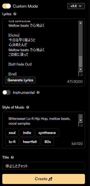 Lyrics に、ChatGPT で生成された歌詞を入力し、最後に[End]を追加します。