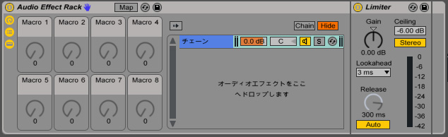 もう1つの後続するエフェクトラック追加し、1つチェーンを作りリミッターを挿入します。