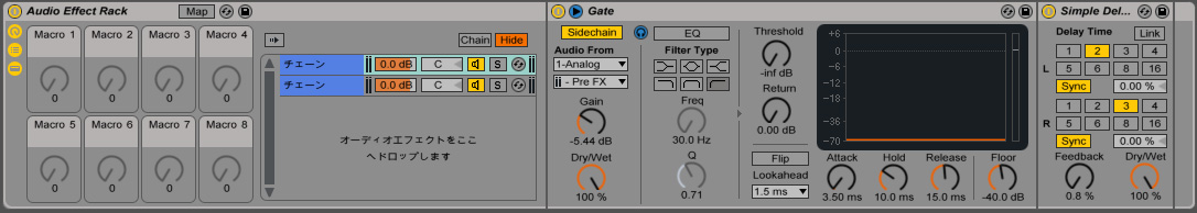 ディレイの前に、Gate を挿入します。そして、Sidechanを有効にし、すぐ右のヘッドフォンボタンをオン(青)にします。