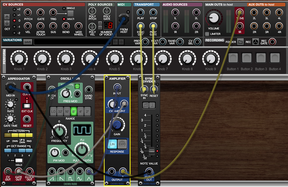 Cherry Audio Voltage Modular Arpeggiacor を Host Tempo に Sync させる方法 TRANSPORT SYNC OUT → SYNC DIVIDER SYNC IN TRANSPORT PLAY GATE → SYNC DIVIDER RESET を接続します。 そして、SYNC DIVIDER CLOCK OUT を ARPEGGIATOR CLK IN 入力します。 これで、ARPEGGIATOR が、HOST のテンポ (TRANSPORT)に同期するようになります。 SYNC DIVIDERの スライダでレートを変更しましょう。