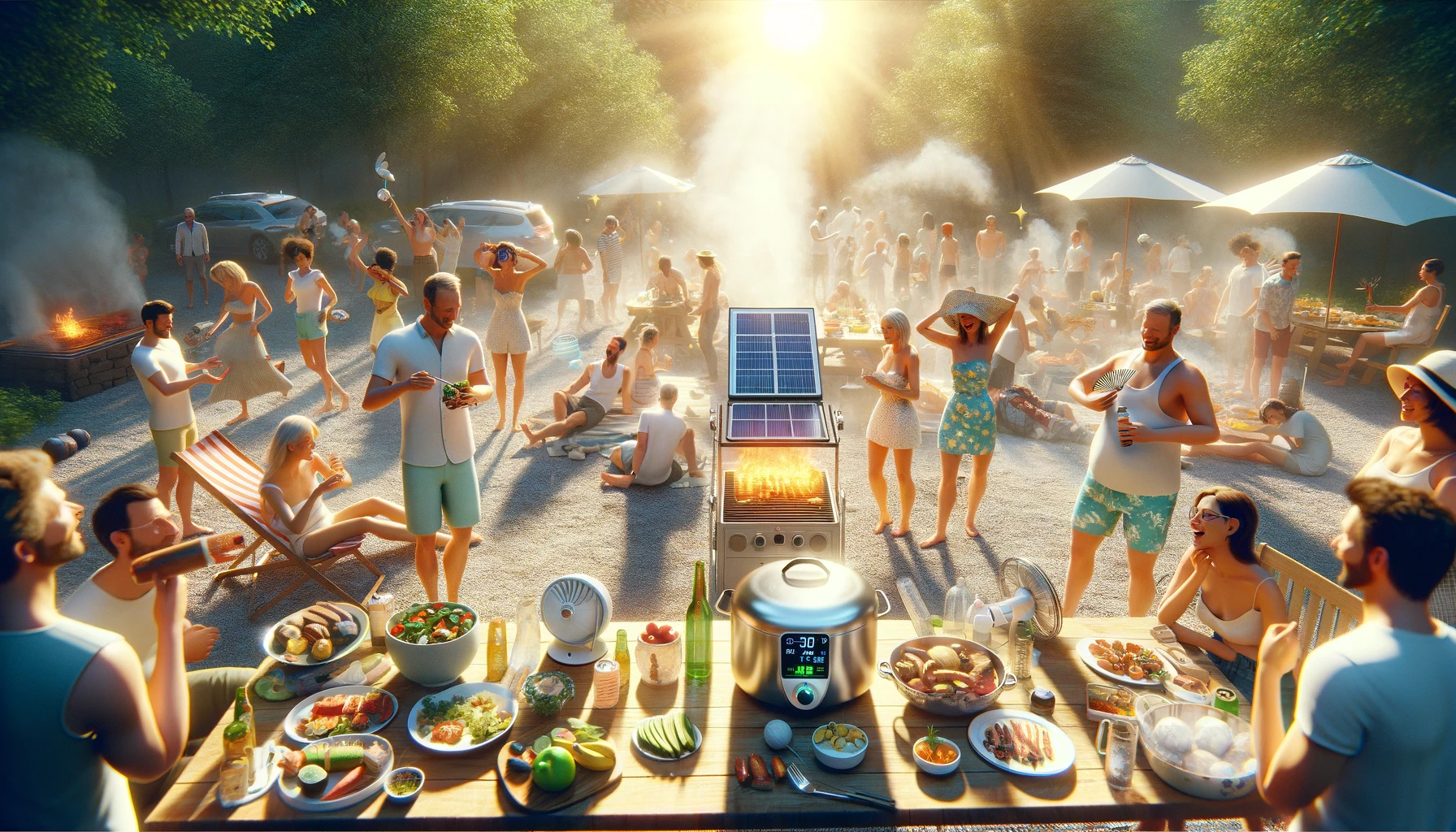 ちなみに、この画像生成のプロンプトを和訳したものは、次のようになります。摂氏40度近い炎天下で、火を使わずに屋外でバーベキューをするシーンを、超リアルなデジタル描写で表現すること。公園や裏庭で、火を使わない画期的な調理器具を囲む人々をクリエイティブに描写する。さまざまな年齢や性別の登場人物が、薄手の夏服に身を包み、暑さに対処する喜びと革新的な表情を見せながら、イベントを楽しんでいる。調理方法としてソーラークッカーやポータブル電気グリルが使われ、夏の料理が並べられ、涼むために扇風機や手持ちの霧吹きを使う人々など、細部にまで工夫が凝らされている。オブジェクトやキャラクターの配置は、16:9のアスペクト比の中ですべての重要な要素がはっきりと見えるように注意深く計画されている。照明とVFXは、暑くて日差しの強い雰囲気を引き立て、カメラアングルは、伝統的なバーベキューの火を使わずに、楽しくエコフレンドリーな集まりの本質を捉える。